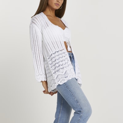 White Womens 100 Cotton Crochet Cardigan WoolOvers US